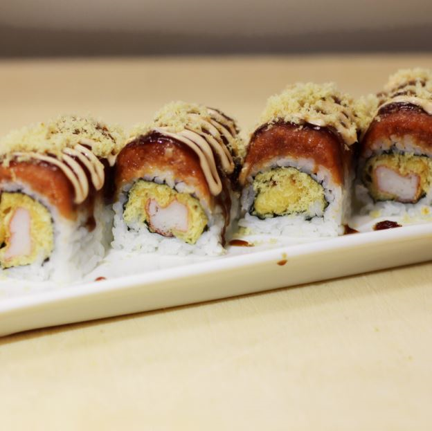 Shredded crabmeat, avocado, cucumber and shrimp tempura inside with sliced Tuna mixed with spicy mayo and eel sauce on the top.