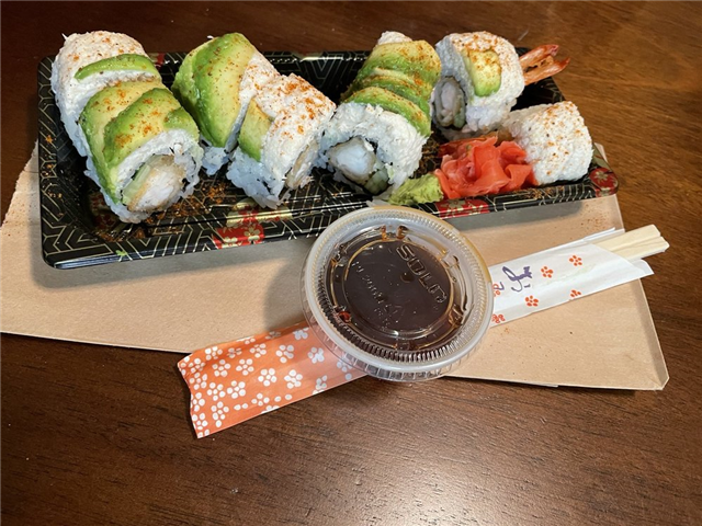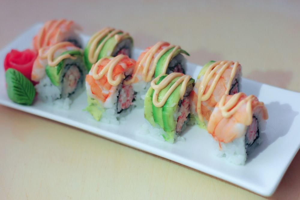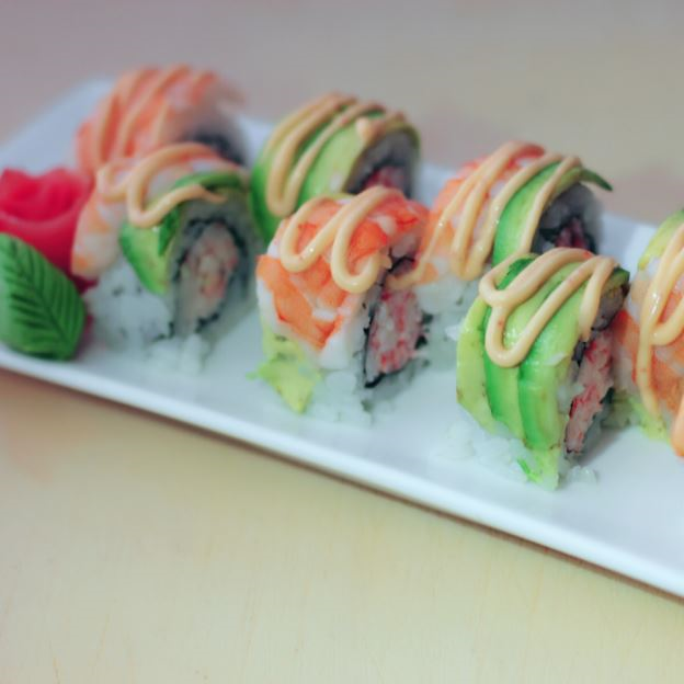 8 piece. Eel, salmon and avocado roll with shrimp and avocado on top. Eel sauce on the top.