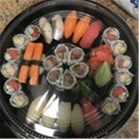60 pieces. Includes 20 pieces of assorted sashimi, 10 piece sushi and 30 piece maki roll.