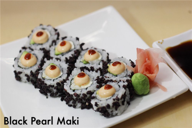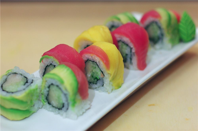 8 piece. Spicy white tuna and cucumber roll with fresh mango, avocado and tuna on the top. Spicy chili sauce on the top.